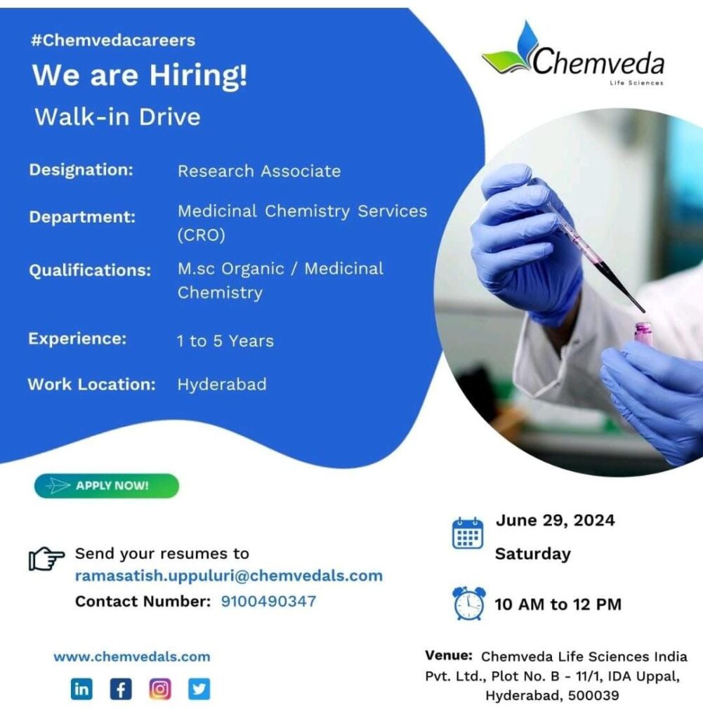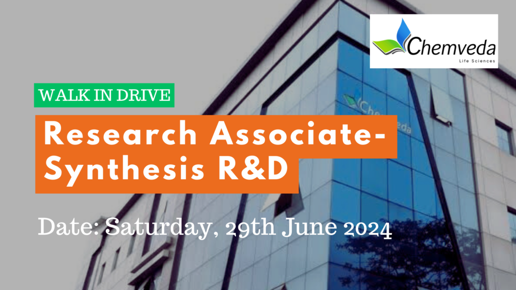 Chemveda Life Sciences Walkin for Research Associate in Synthesis R&D on Saturday, 29th June 2024