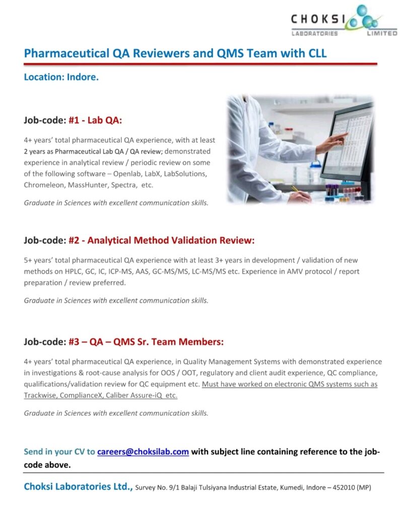 CHOKSI LABORATORIES LIMITED hiring QA Reviewers, Lab QA & QMS Team candidates at Indore