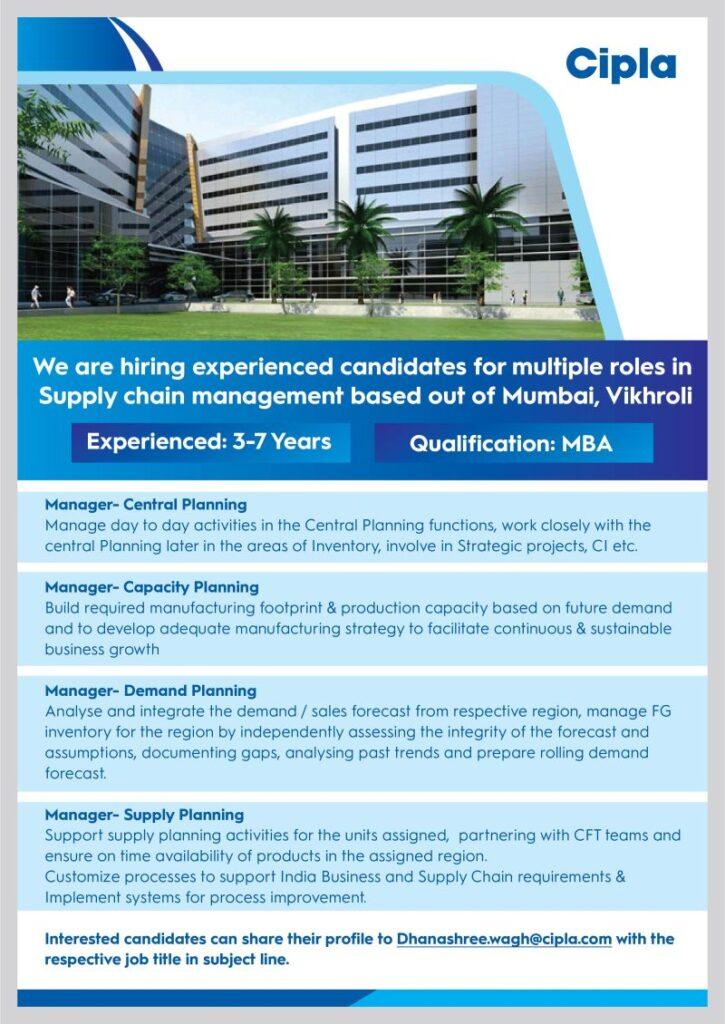 Interested candidates can share their profile to Dhanashree.wagh@cipla.com with the respective job title in subject line.