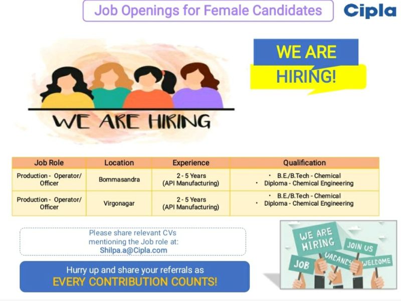 Cipla Job Openings for Female Candidates in Production at Bommasandra & Virgonagar location