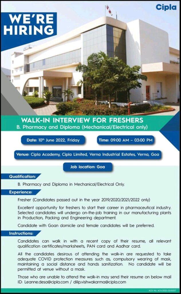 Those who are unable to attend the walk-in may send their resume on below mail ID: Leanne.desa@cipla.com/ dilip.vishwakarma@cipla.com