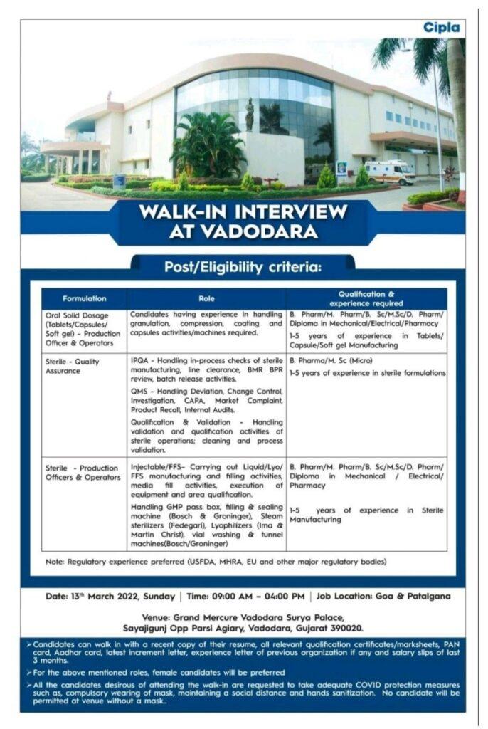 Cipla Limited. Walk In Interview for Oral Solid Dosage & Sterile- Production Officers/ Operators on 13th March 2022