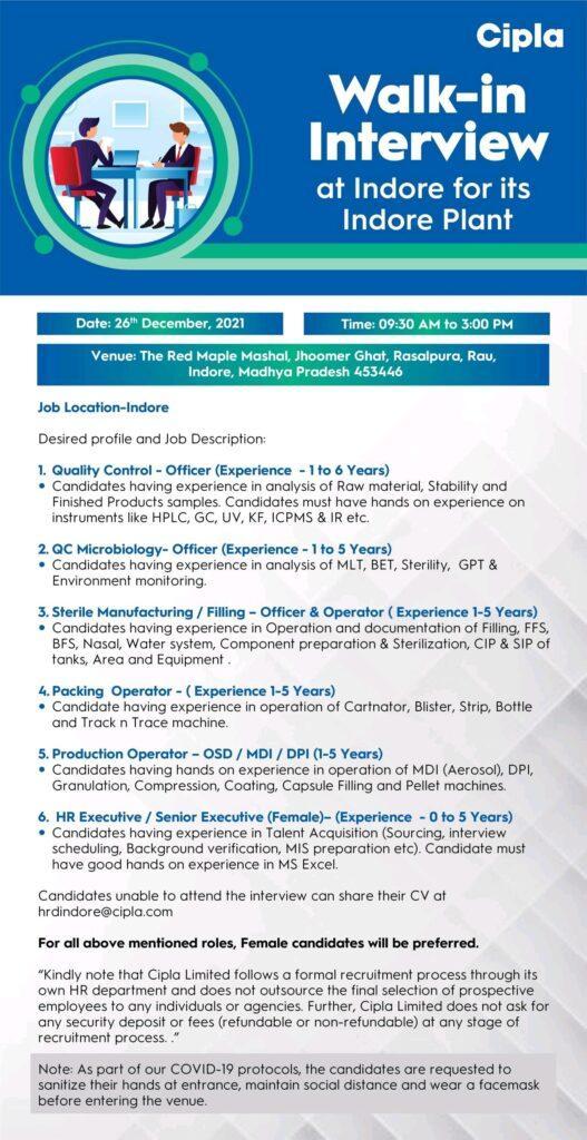 Candidates unable to attend the walk-in may send their resume on below mail ID: hrdindore@cipla.com