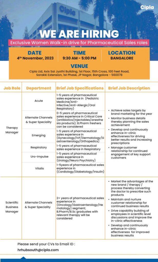 Cipla Ltd WALK-IN DRIVE at Bangalore on 4th November 2023. B.Pharm freshers will be considered