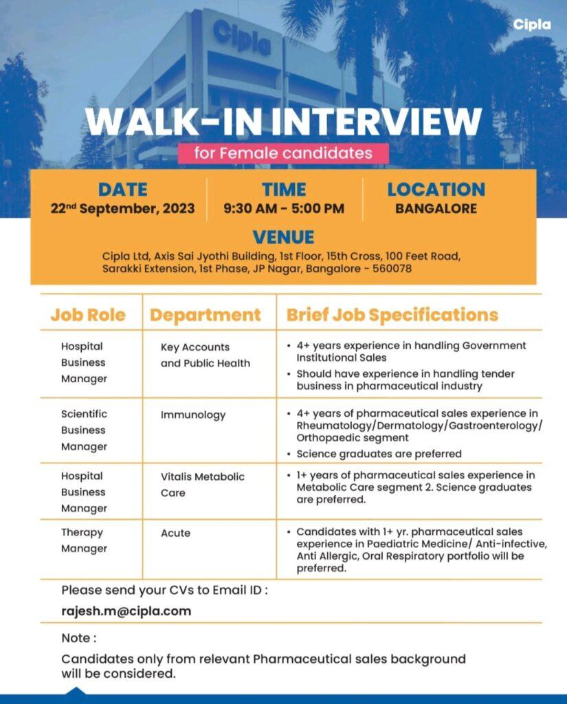 Cipla Ltd Walk In Drive on 22nd September, 2023 for female candidates