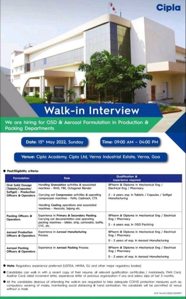 Cipla Ltd Walk-in Interview at Goa on 15th May 2022, Sunday