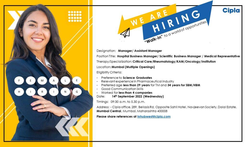 Cipla opportunity for female candidates in Hospital Business Manager/Key account Manager role at Mumbai