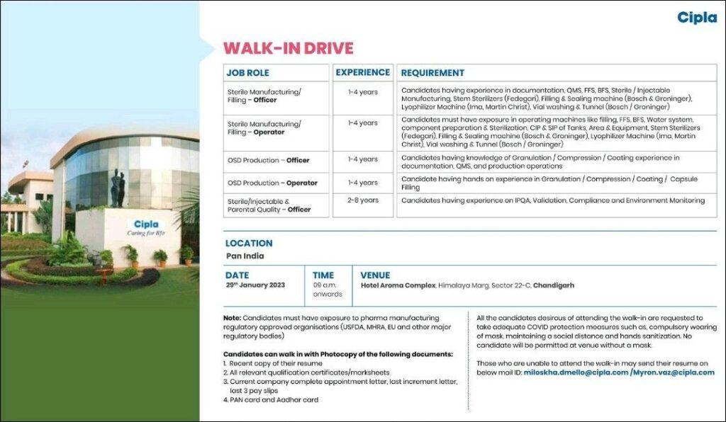 Those who are unable to attend the walk-in may send their resume on below mail ID: miloskha.dmello@cipla.com /Myron.vaz@cipla.com