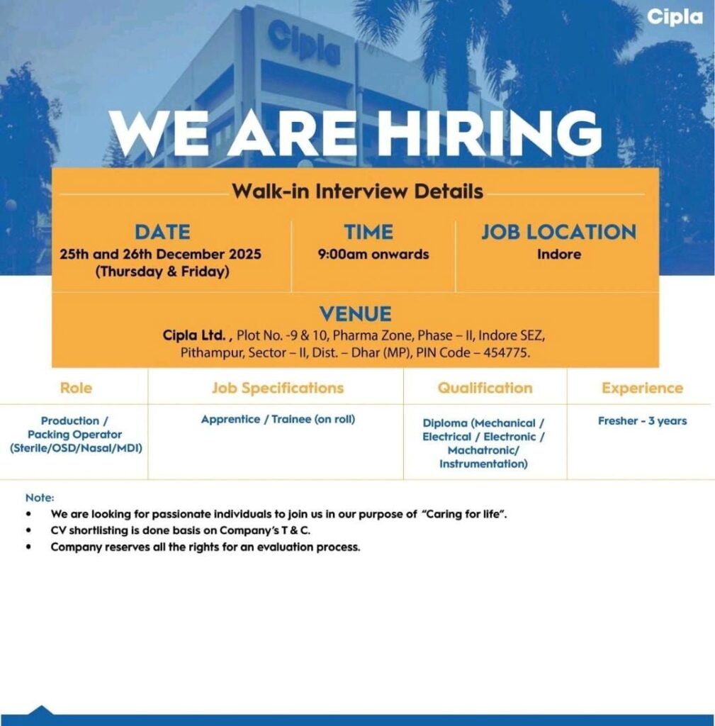 Cipla Ltd., a global pharmaceutical leader, has announced a major recruitment drive for its facility in Indore. This walk-in interview event is specifically targeted at individuals looking to build a career in pharmaceutical manufacturing, focusing on production and packing operations.