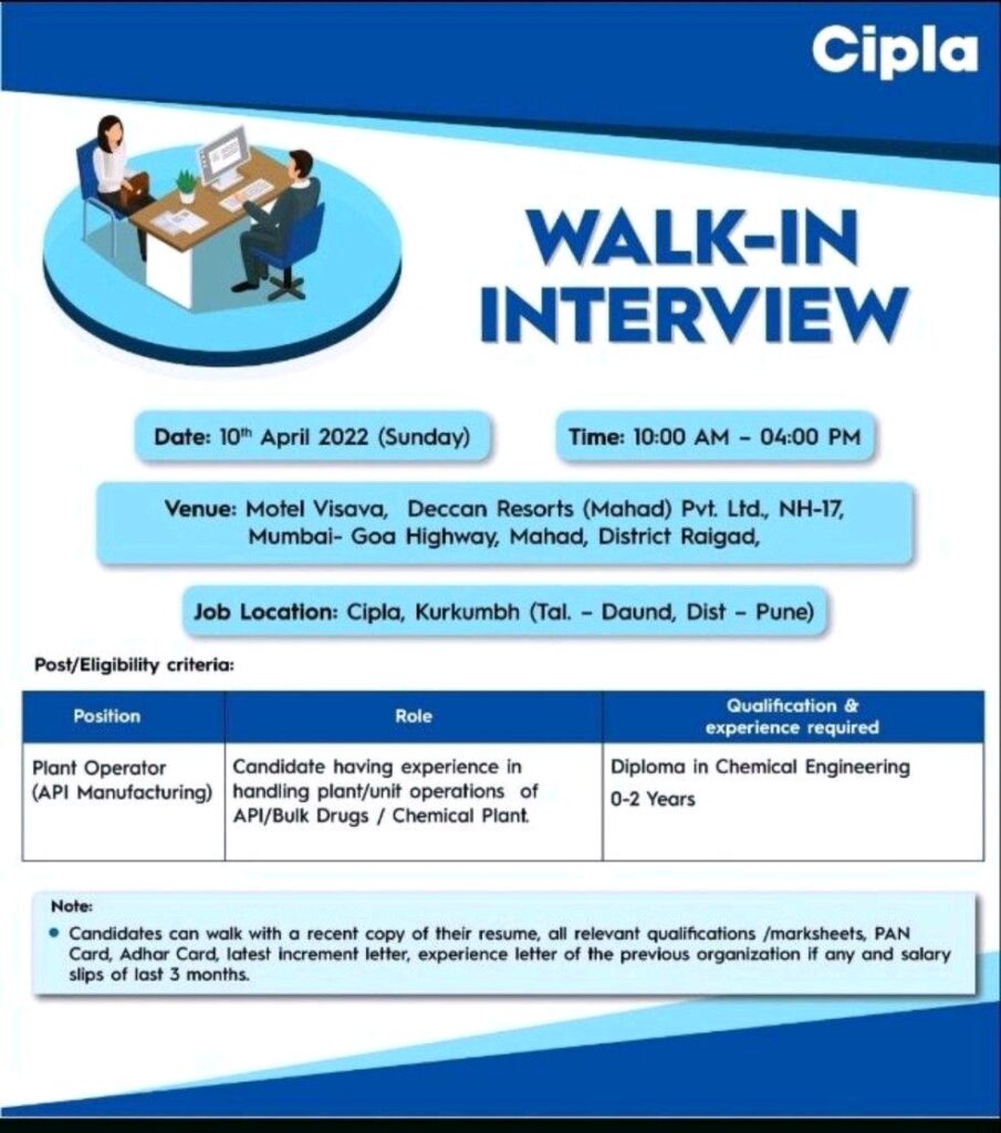 Cipla WALK-IN INTERVIEW for Freshers Diploma candidates on 10th April 2022 (Sunday)