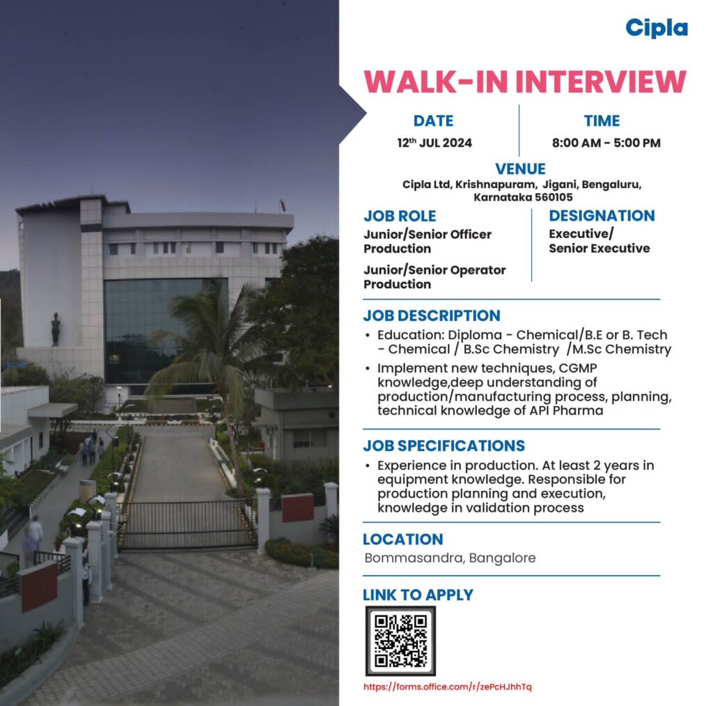 Cipla walk in interview for Operator/ Junior/ Senior Officer/ Executive/ Senior Executive- Production at Bommasandra, Bangalore