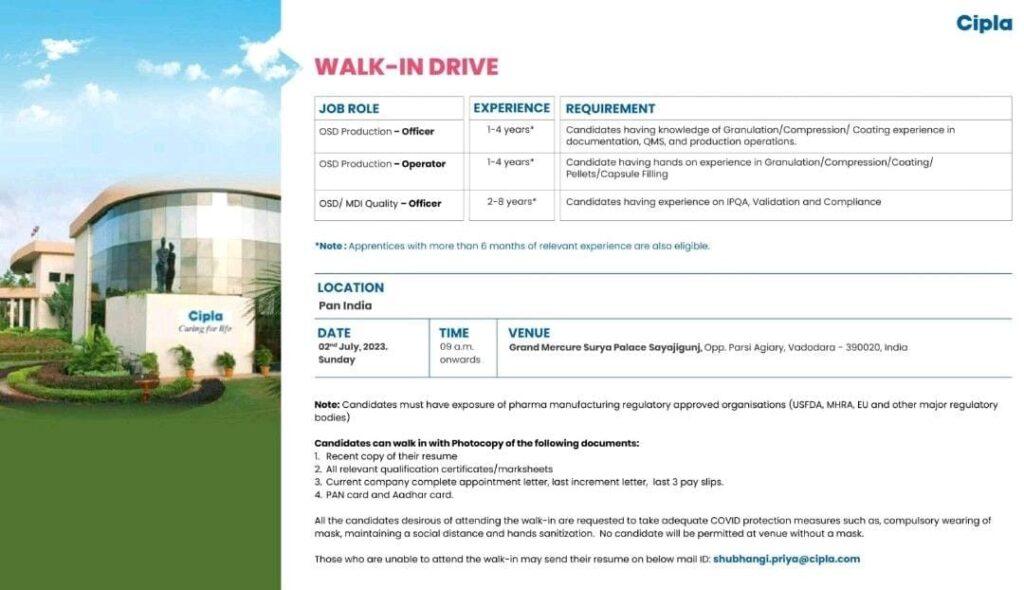 Cipla Walk in Interview for Operator/ Officer – Production/ MDI Quality department on 02 July, 2023 (Sunday)