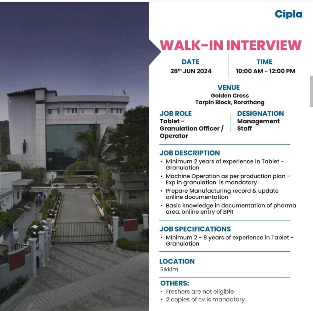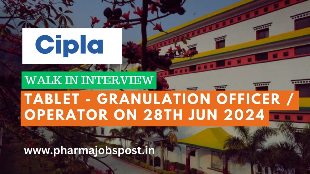 Cipla walk in interview for Tablet – Granulation Officer / Operator on 28th JUN 2024