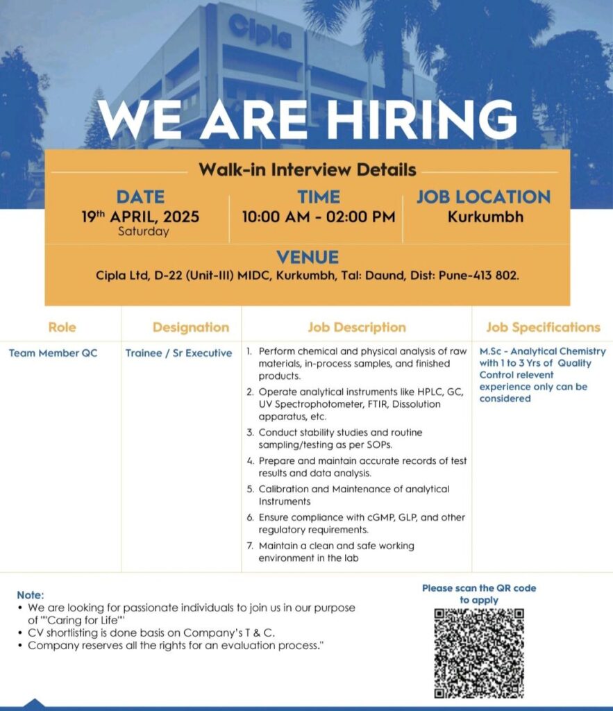 M.Sc – Analytical Chemistry with 1 to 3 Yrs of Quality Control relevant experience only can be considered
