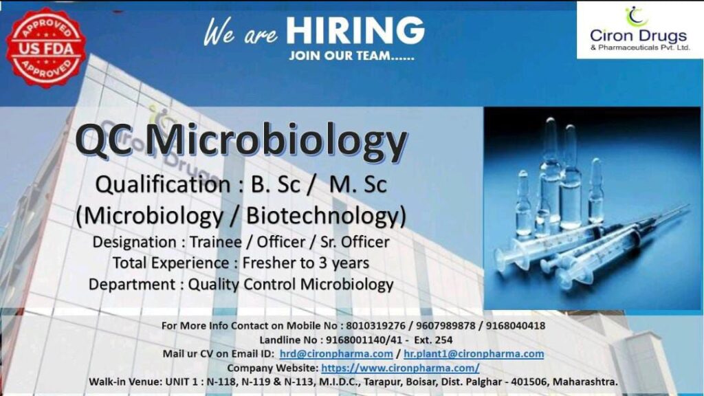 Mail ur CV on Email ID: hrd@cironpharma.com/hr.plant1@cironpharma.com