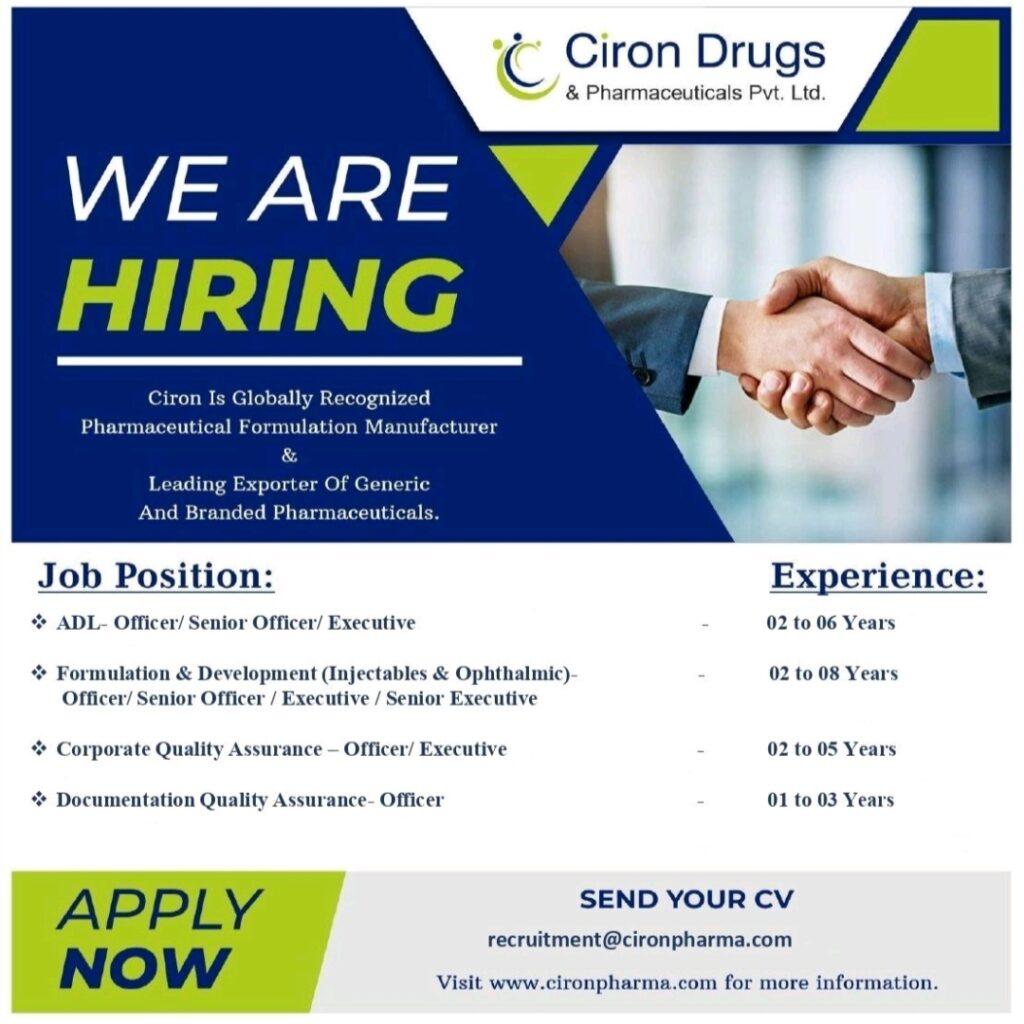 Ciron Drugs & Pharmaceuticals job vacancy for Officer/ Senior Officer/ Executive / Senior Executive – ADL, Corporate Quality Assurance, Documentation Quality Assurance, Formulation & Development (Injectables & Ophthalmic)