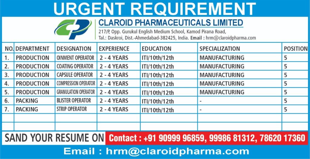 Clariod Pharmaceuticals Limited, a rapidly expanding pharmaceutical manufacturer based in Ahmedabad, has released an urgent requirement notification for multiple operator-level positions in the Production and Packing departments. The company is looking for candidates with hands-on experience in various manufacturing operations and invites skilled professionals to apply immediately.