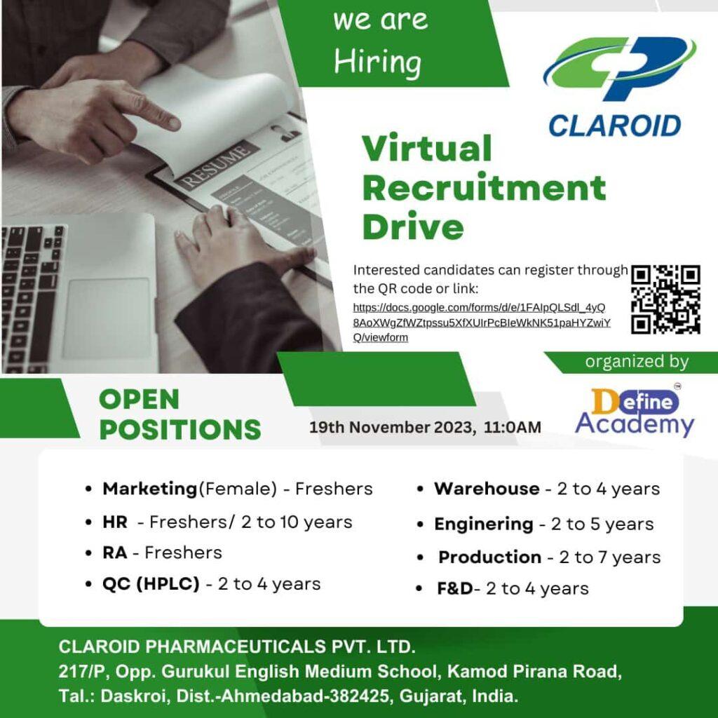 Claroid Pharmaceuticals Pvt. Ltd. Virtual Recruitment Drive for multiple opening in RA, Marketing Coordinator, HR, QC, Engineering, F&D, Warehouse department