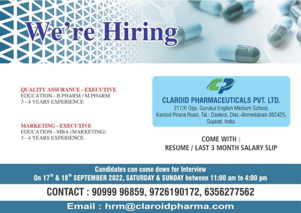 CLAROID PHARMA Walk In Interview for Executive- QA & Marketing on 17th & 18th September 2022