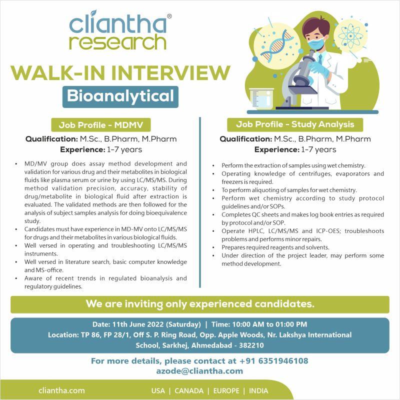 Cliantha Research Limited Walk-in interviews on 11th June, 2022 for Bioanalytical- MDMV, Study Analysis