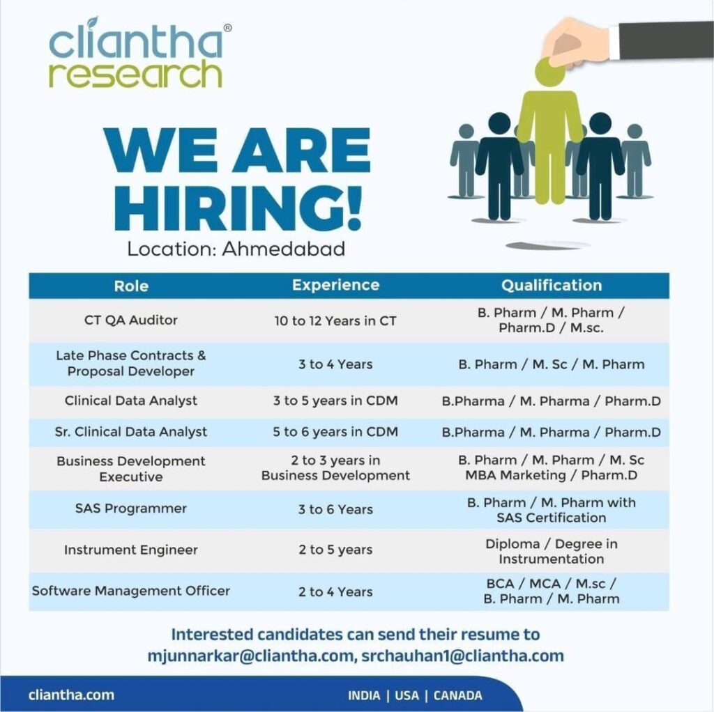 - Qualifications: B. Pharm / M. Pharm / Pharm.D / M.Sc.