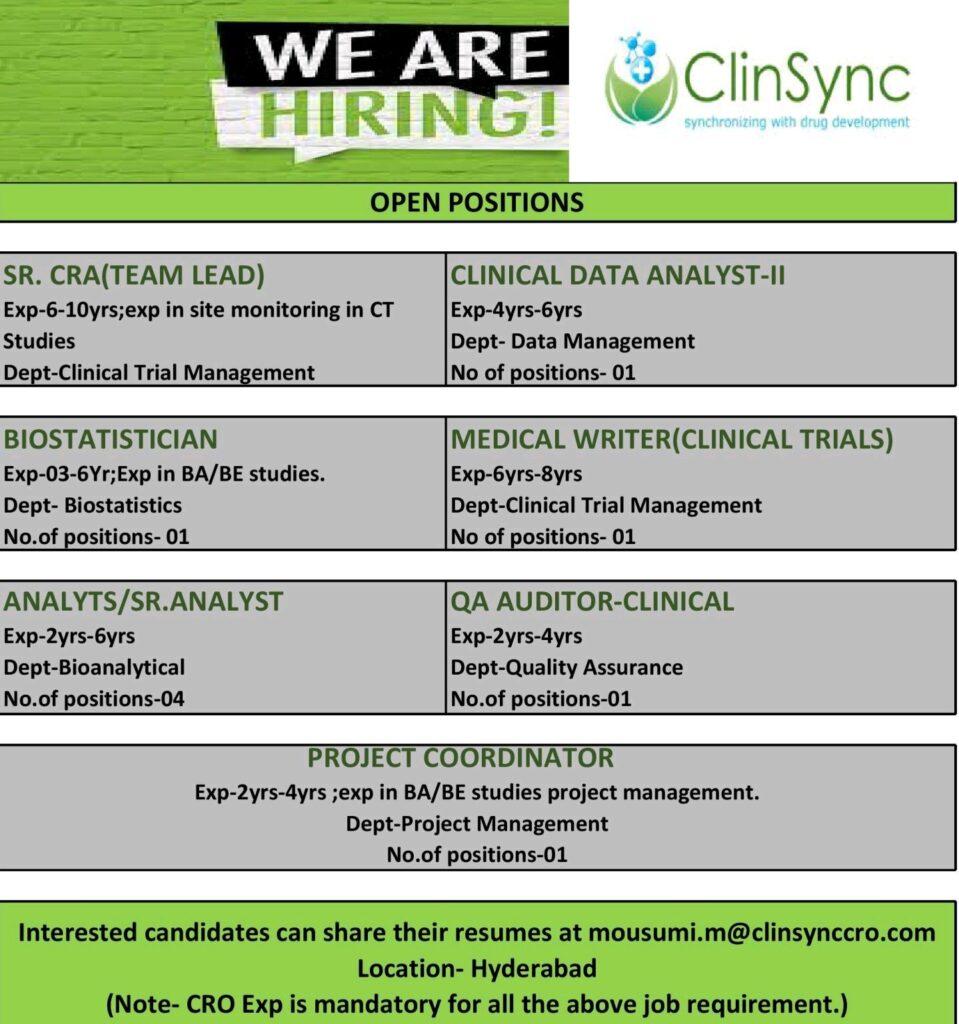 ClinSync Clinical Research Pvt Ltd hiring for SR. CRA(TEAM LEAD), BIOSTATISTICIAN, ANALYTS/ SR.ANALYST, CLINICAL DATA ANALYST-II, MEDICAL WRITER(CLINICAL TRIALS), QA AUDITOR-CLINICAL, PROJECT COORDINATOR -Apply Now