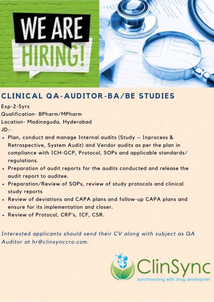 We have opening for the position of Clinical QA Auditor( BA/BE Studies).Interested candidates please apply at hr@clinsynccro.com