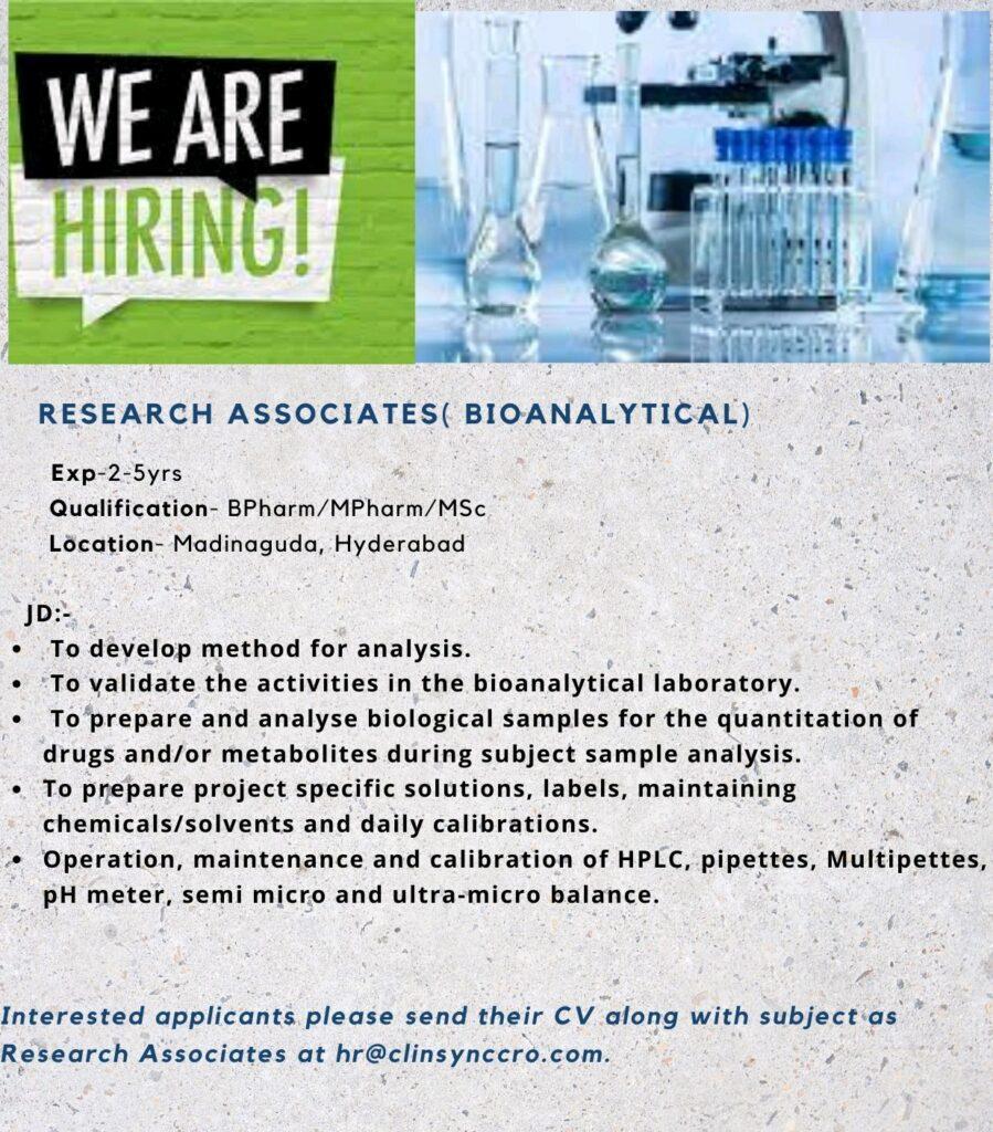 ClinSync hiring for Research Associates (Bioanalytical) department