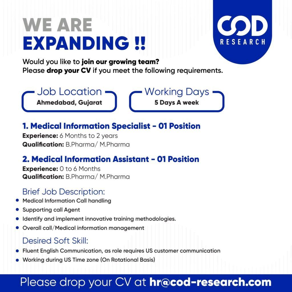 COD Research Private Limited hiring B.Pharma/ M.Pharma freshers & experience candidate for Medical Information Specialist & Assistant – Apply Now