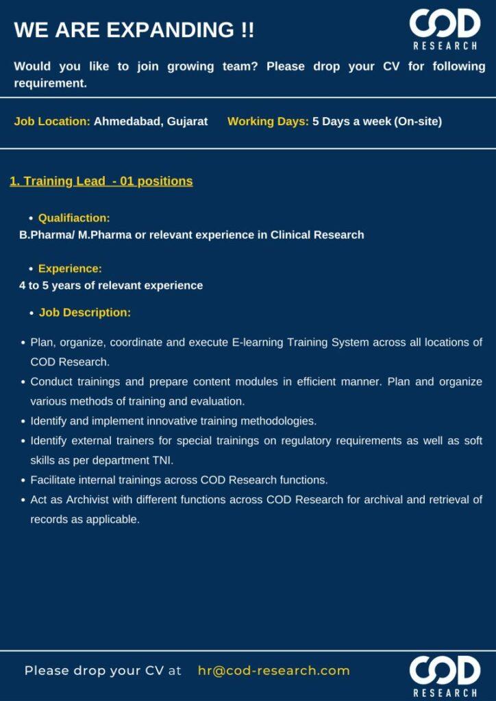 COD Research Private Limited hiring for Training Lead at Ahmedabad, Gujarat