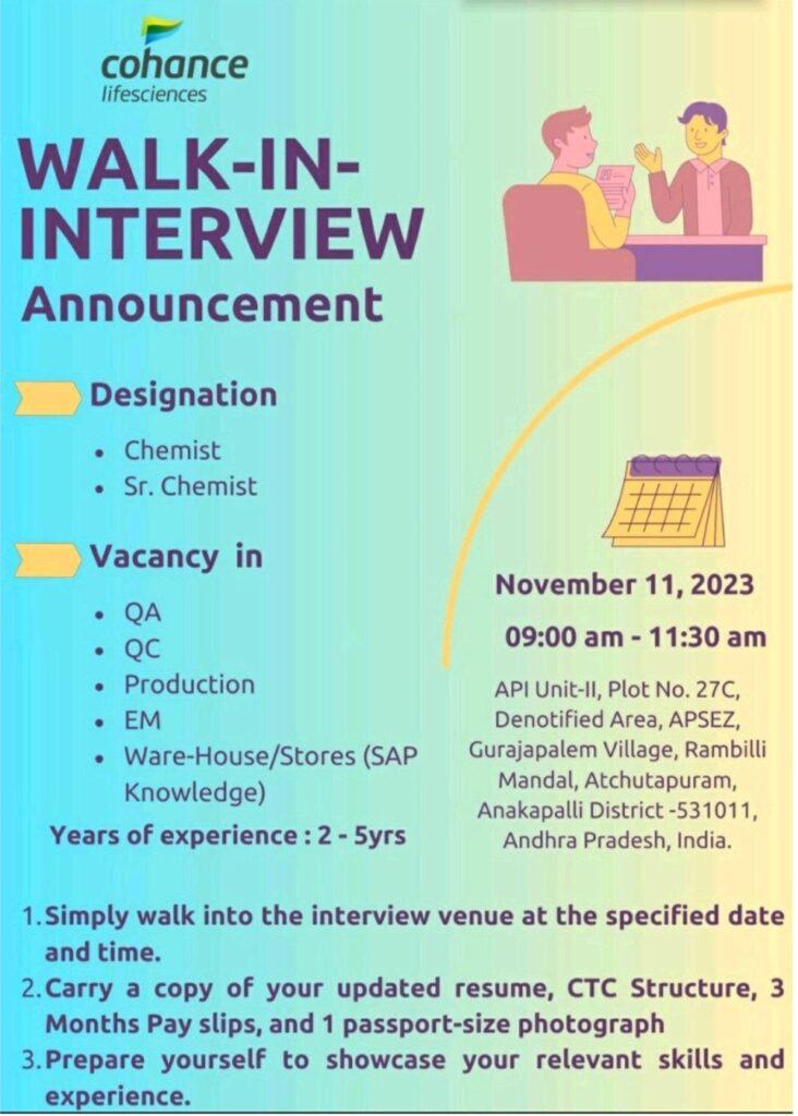 Cohance is conducting walkin interviews on 11th Nov 2023 at its API unit II, Vizag plant | QA, QC, Production, EM, WareHouse/Stores
