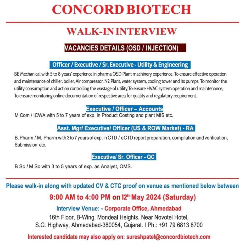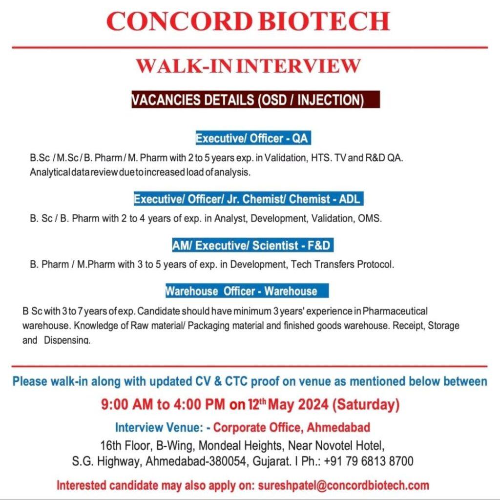 Concord Biotech announces walk-in interviews for vacancies in the OSD/Injection unit on May 12th, 2024 at the Corporate Office, Ahmedabad.