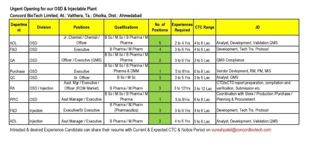 Concord BioTech Limited Urgent Opening for OSD & Injectable Plant – ADL, F&D, QA, QC, Purchase, RA, PPIC, F&D department