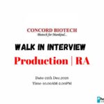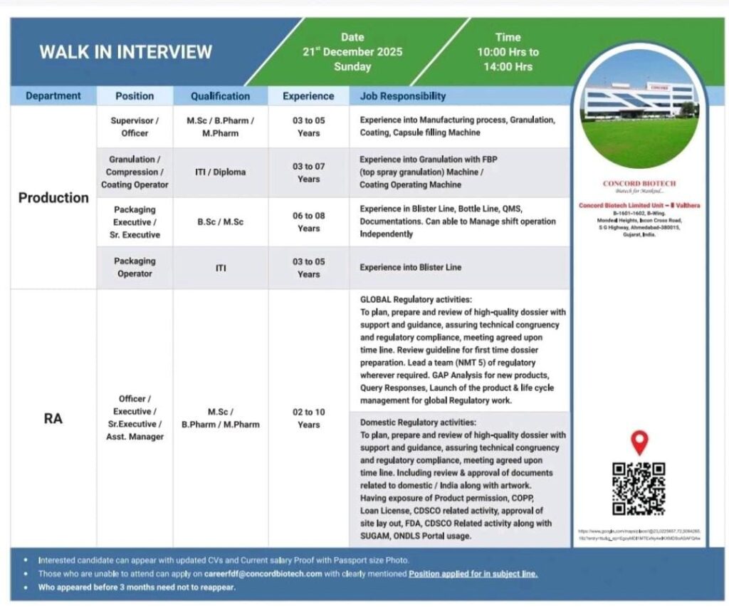 Are you looking to advance your career in the pharmaceutical industry? Concord Biotech Limited is hosting a walk-in interview drive for its Unit-II in Valthera. This is a fantastic opportunity for experienced professionals in Production and Regulatory Affairs (RA) to join a growing team in Ahmedabad, Gujarat.