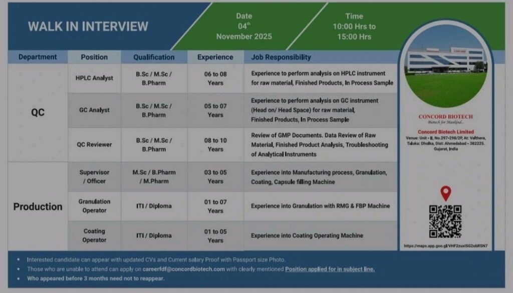 Concord Biotech Limited, a reputed biopharmaceutical company known for its expertise in fermentation-based active pharmaceutical ingredients, is conducting a Walk-In Interview for experienced professionals in Quality Control (QC) and Production departments. This interview is an excellent chance for skilled candidates to build a strong career with a leading pharma organization in India.