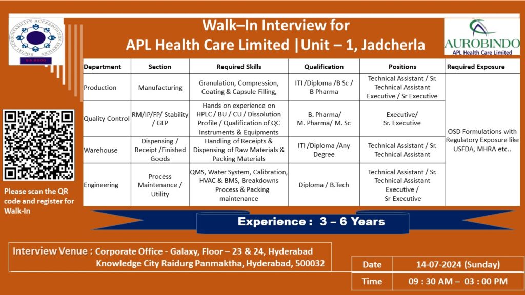 Conducting Walk In Interviews for APL Health Care Ltd, Unit 1(Jadcherla) on 14th July 24 (Sunday) at Aurobindo Corporate Office, Hyderabad.