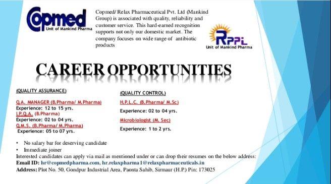 Interested candidates can apply via mail as mentioned under or can drop their resumes on the below address: Email ID: hr@copmedpharma.com, hr.relaxpharma1@relaxpharmaceuticals.in Address: Plot No. 50, Gondpur Industrial Area, Paonta Sahib, Sirmaur (H.P.) Pin: 173025