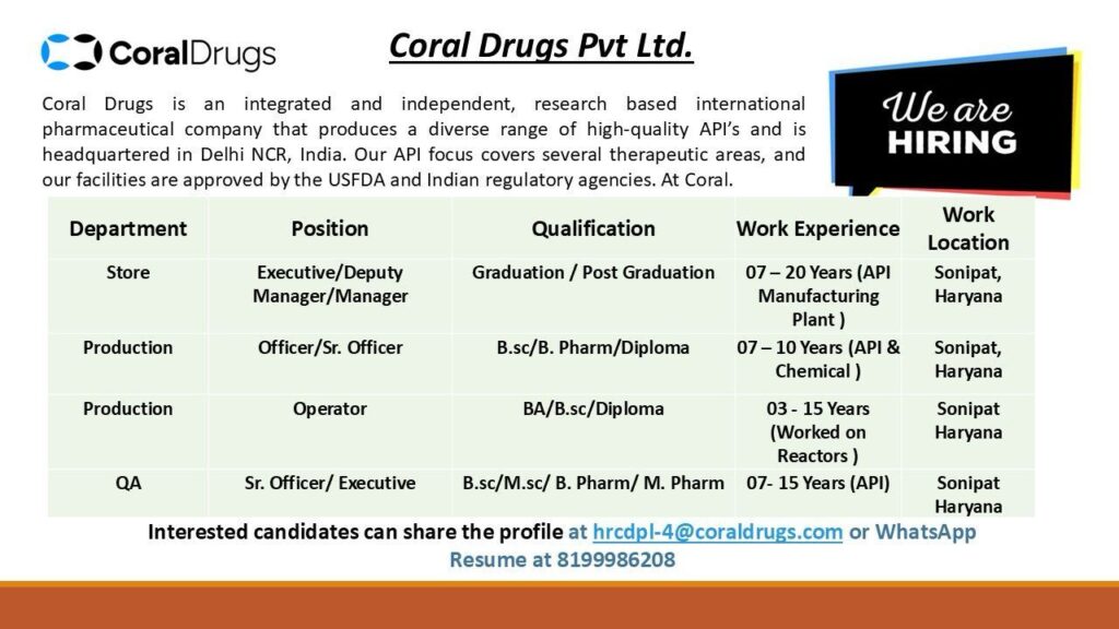 Coral Drugs Pvt. Ltd., a reputed and research-driven international pharmaceutical company, has announced multiple vacancies across various departments at its Sonipat, Haryana facility. Known for producing a wide range of high-quality Active Pharmaceutical Ingredients (APIs), the company is headquartered in Delhi NCR and operates with approvals from USFDA and Indian regulatory bodies.