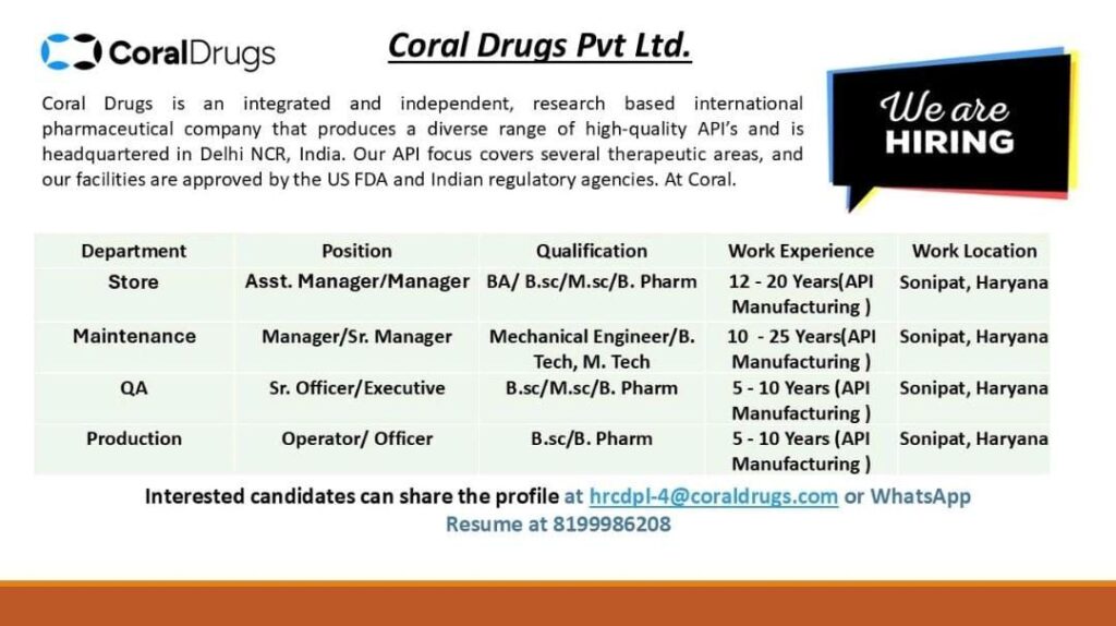 Coral Drugs Pvt. Ltd. is an independent, research-based international pharmaceutical company headquartered in Delhi NCR, India. The company specializes in producing high-quality APIs (Active Pharmaceutical Ingredients) for several therapeutic areas. Coral’s facilities are approved by the US FDA and Indian regulatory authorities, ensuring world-class standards in pharmaceutical manufacturing.