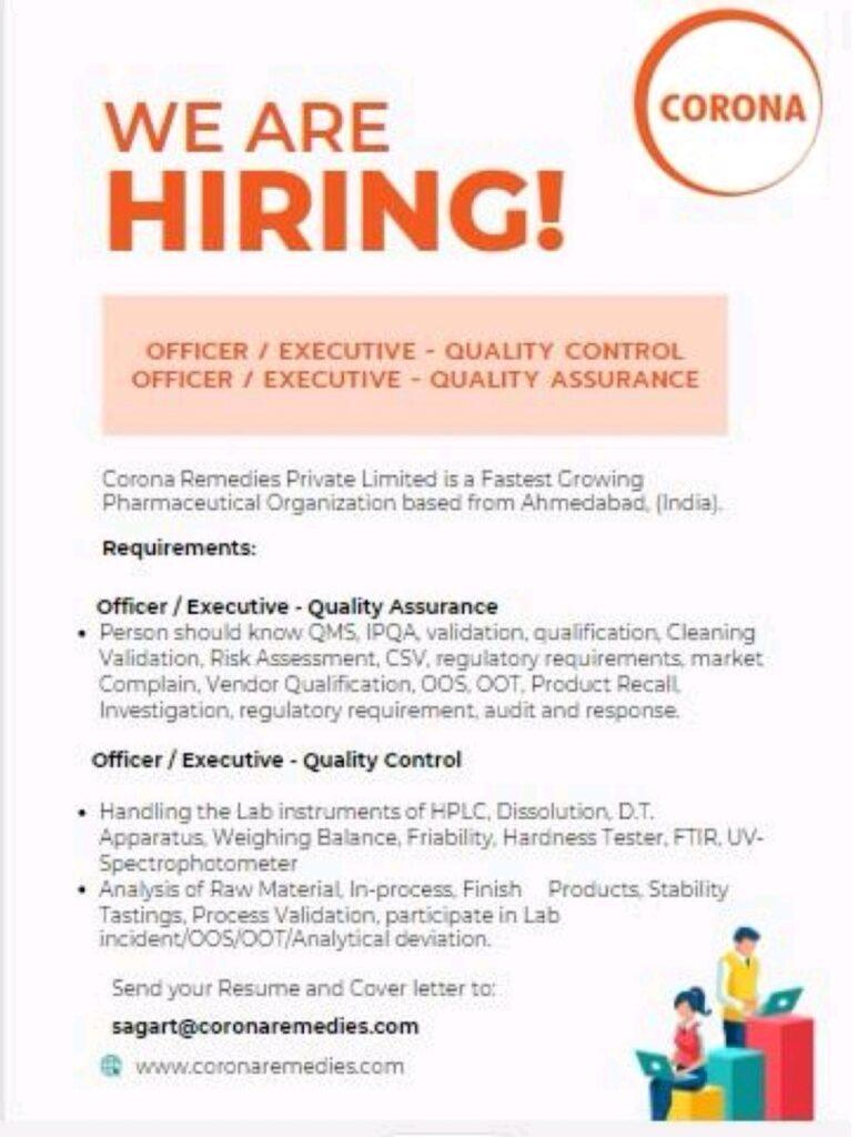 Corona Remedies job vacancy for Officer/Executive – QA & QC department