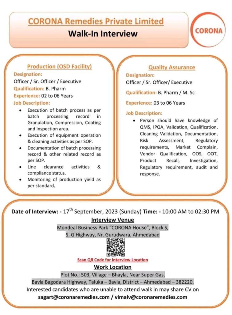 Interested candidates who are unable to attend walk in may share CV on sagart@coronaremedies.com/ vimalv@coronaremedies.com