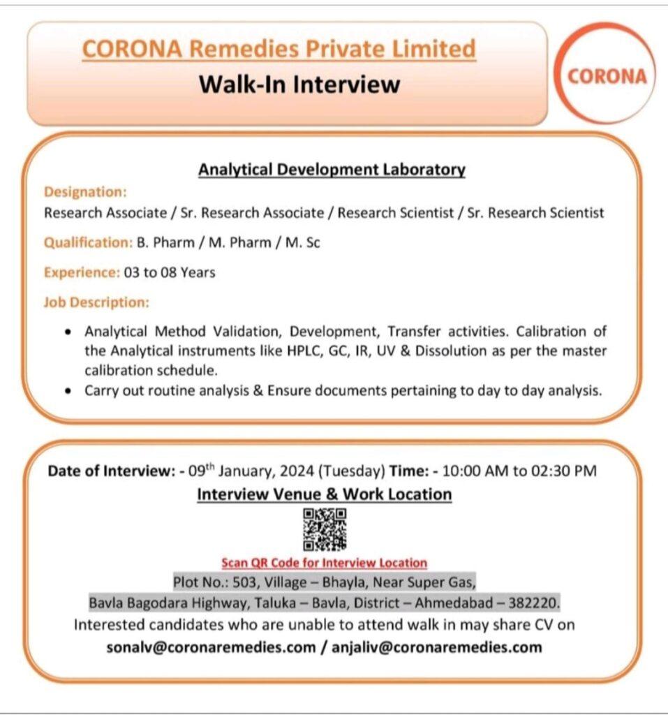 CORONA Remedies Private Limited walk in interview on 09th January, 2024