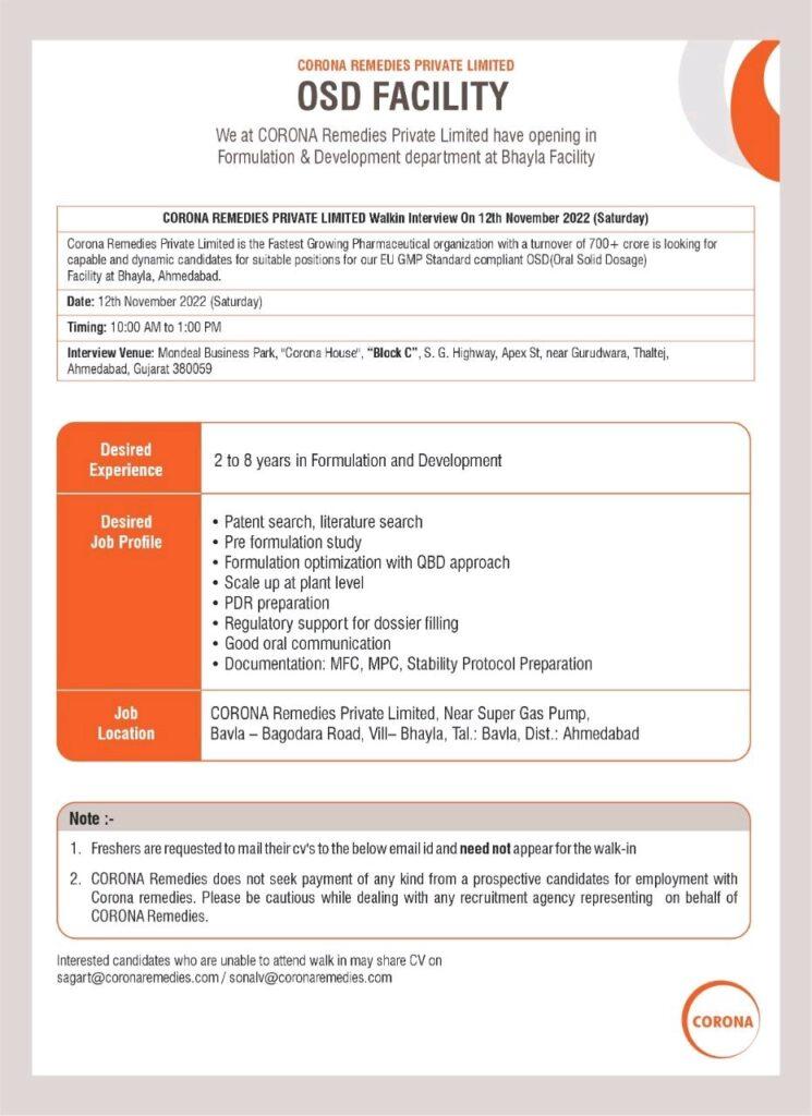 CORONA Remedies Private Limited Walkin Interview for Formulation & Development department on 12th November 2022