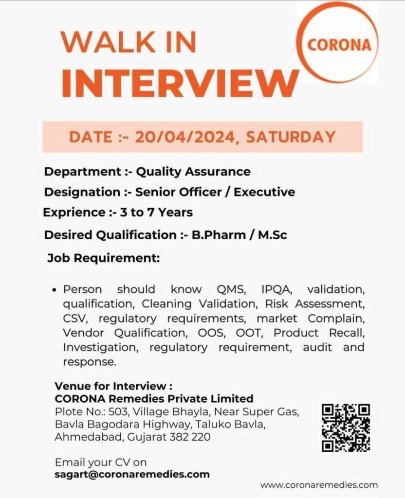 CORONA Remedies walk in interview for Quality Assurance department on 20/04/2024
