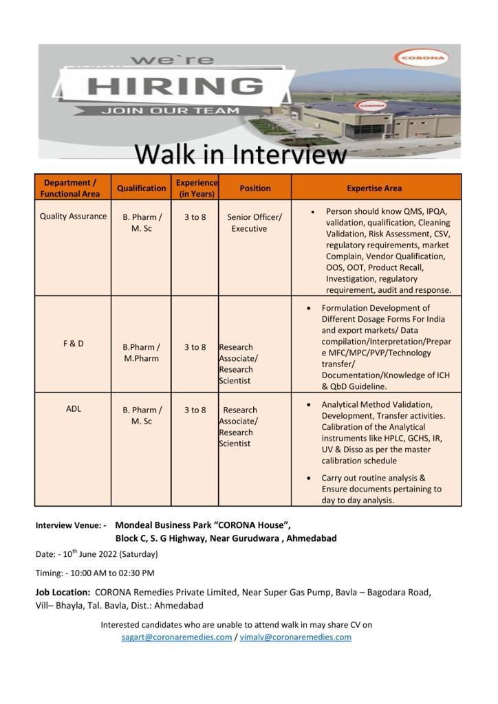 Interested candidates who are unable to attend walk in may share CV on sagart@coronaremedies.com/vimalv@coronaremedies.com