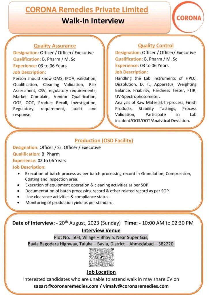 CORONA Remedies Walk-In Interview for Quality Assurance, Quality Control, Production (OSD Facility) on 20th August, 2023 (Sunday)