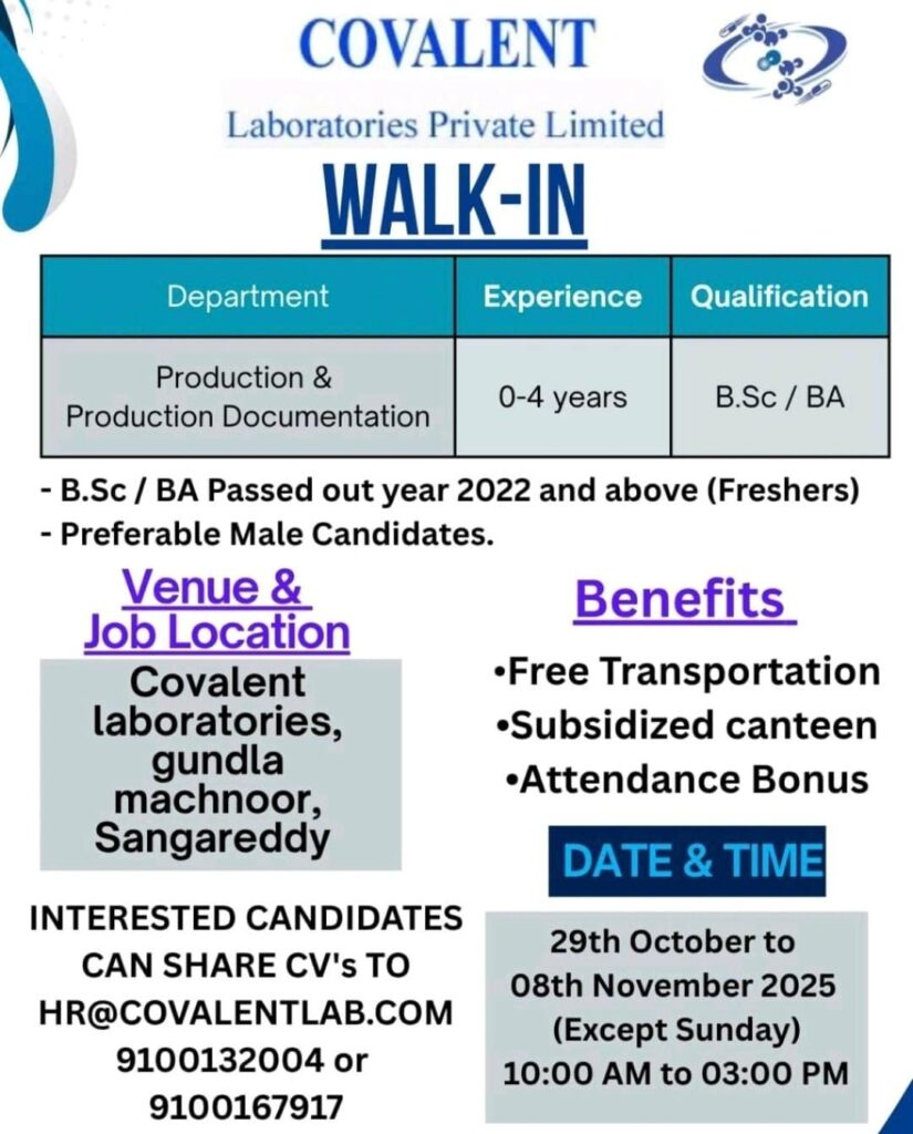 Covalent Laboratories Private Limited, a reputed pharmaceutical manufacturing company, has announced a Walk-In Interview for freshers and experienced candidates in the Production and Production Documentation departments. This is an excellent opportunity for B.Sc and B.A graduates looking to start or grow their careers in the pharma sector.
