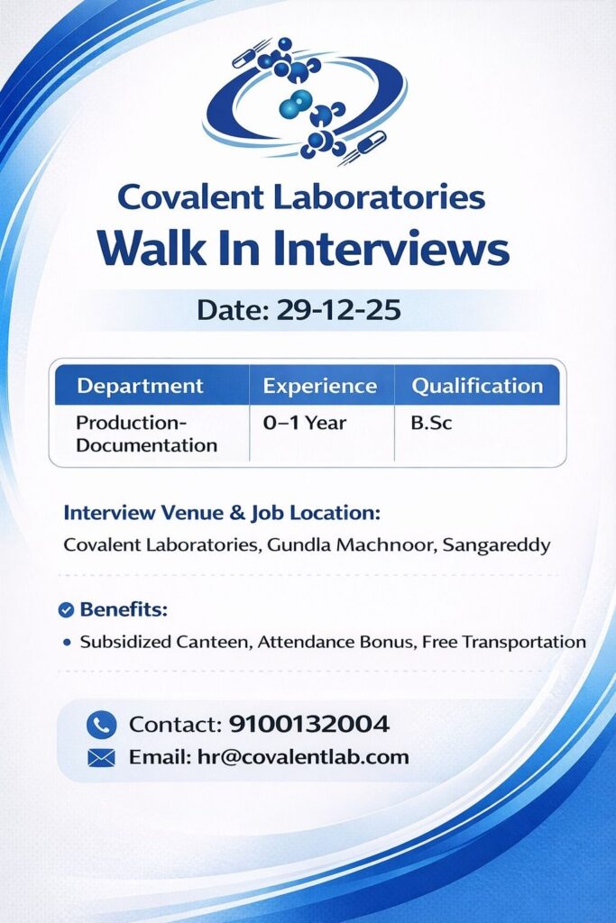Covalent Laboratories is hosting a walk-in interview drive for aspiring professionals looking to kickstart their careers in the pharmaceutical industry. This is an excellent opportunity for recent graduates to join a dynamic production environment and gain hands-on experience in documentation processes.