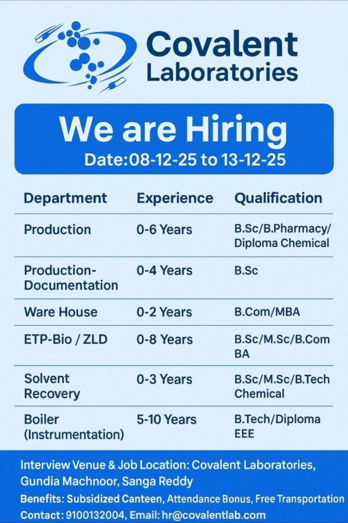 Covalent Laboratories is conducting a hiring drive for experienced and fresh candidates across various departments at its manufacturing facility. If you are looking to advance your career in the pharmaceutical/chemical sector, review the requirements and prepare to attend the interview.