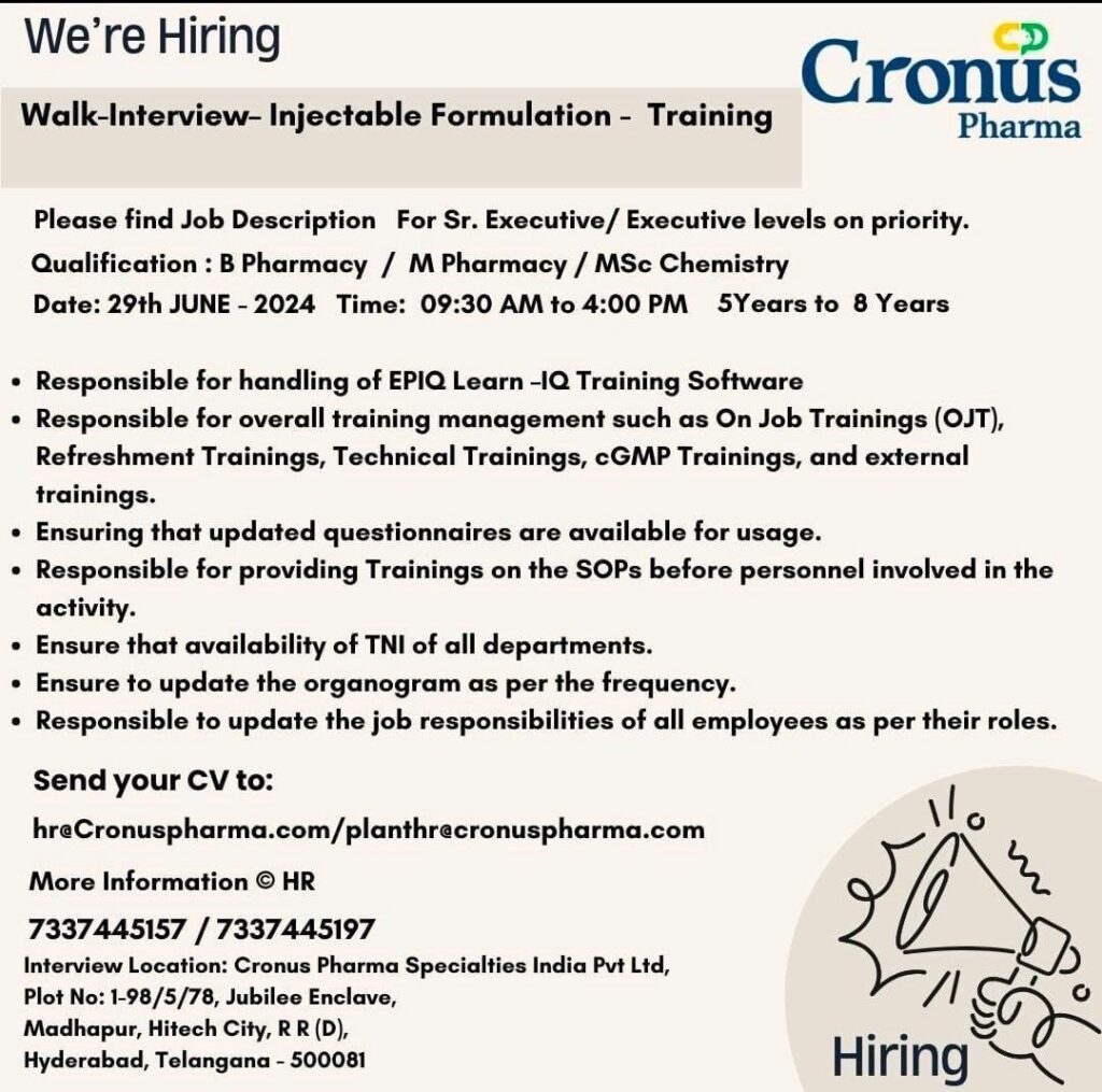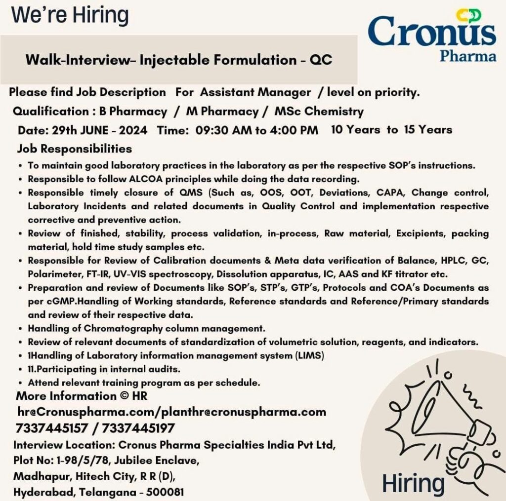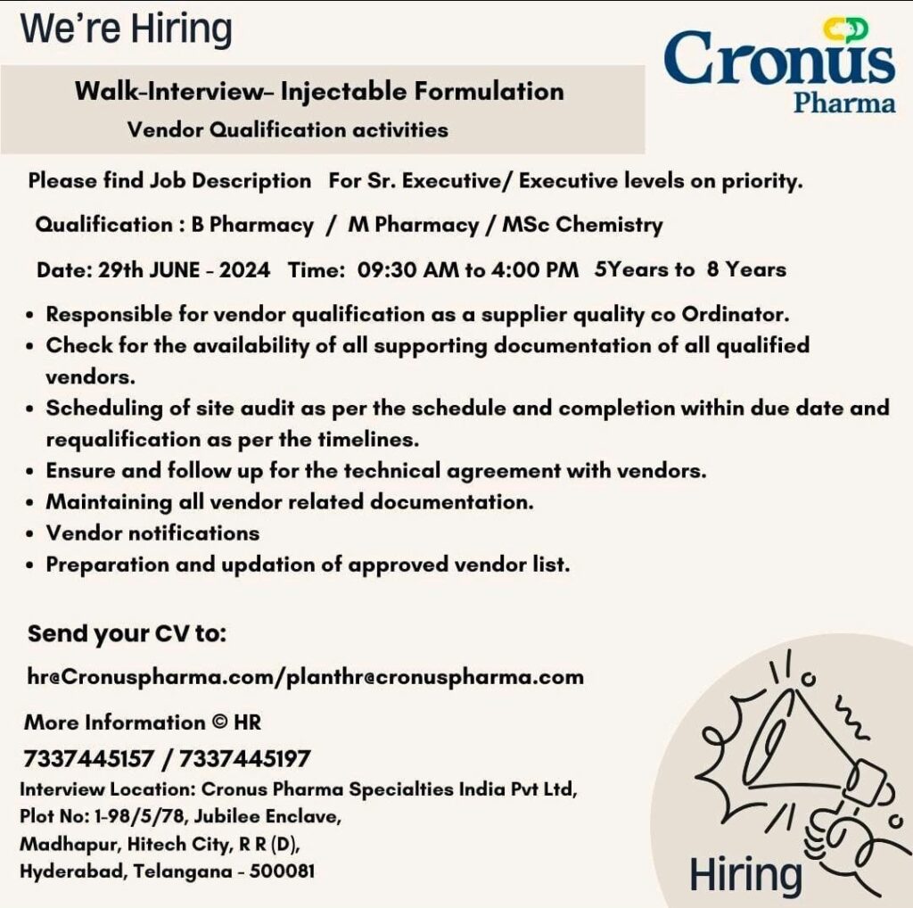 Cronus Pharma Walk-Interview- Injectable Formulation – QC, Vendor Qualification activities & Training on 29th JUNE-2024